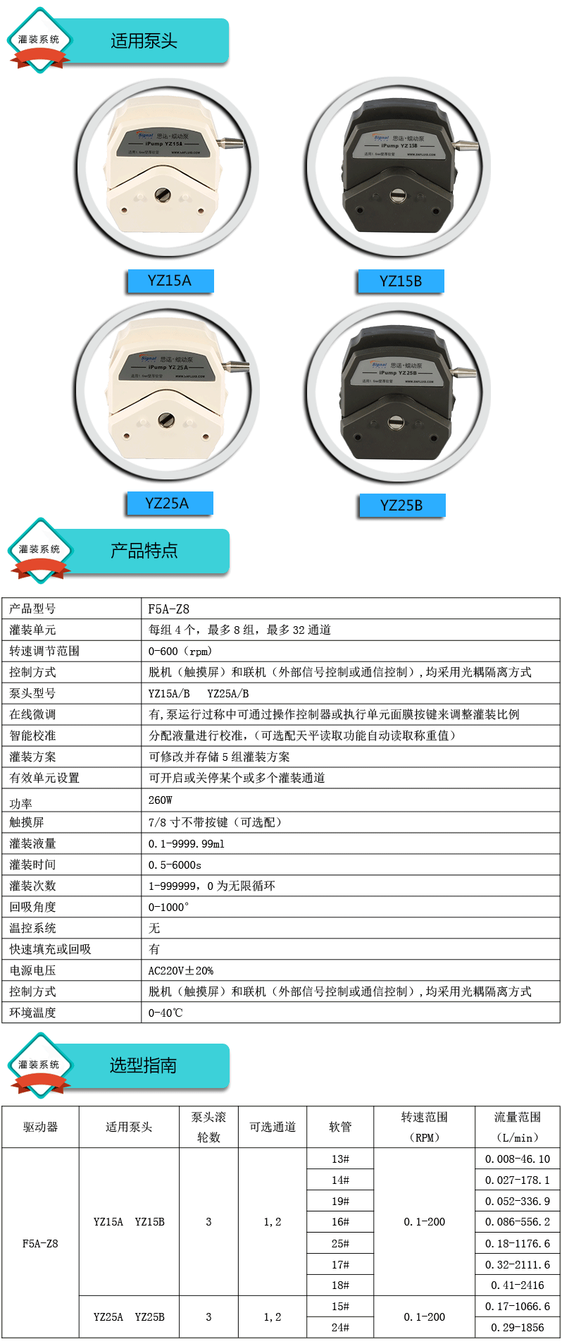 1.灌裝系統由5組基本通道(可擴展至32通道),一臺控制器組成,可安裝YZ15、YZ25泵頭