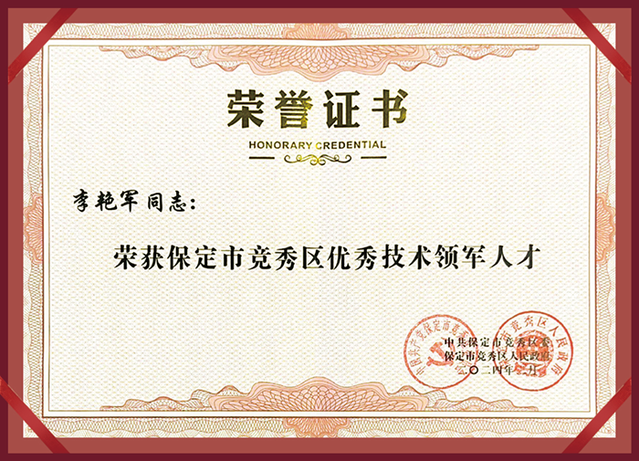 同時,李艷軍先生也榮獲“保定市競秀區(qū)優(yōu)秀技術(shù)領(lǐng)軍人才”榮譽(yù)稱號,并上臺領(lǐng)取了證書。這個榮譽(yù)是對他過去辛勤工作和取得成績的肯定,也是對他未來發(fā)展的鼓勵。他表示,這個榮譽(yù)將激勵他更加努力,在公司的發(fā)展中更加積極地貢獻(xiàn)自己的力量,為競秀區(qū)經(jīng)濟(jì)的進(jìn)一步發(fā)展作出更大的貢獻(xiàn),并由衷的感謝區(qū)領(lǐng)導(dǎo)的嘉獎和認(rèn)可,并表示衷心感激!